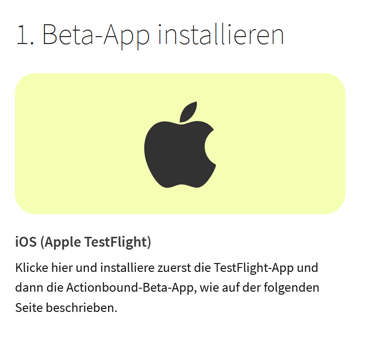Auf der Landingpage der Beta-App unter „1. Beta-App installieren“ auf „iOS“ klicken und dem Link folgen: