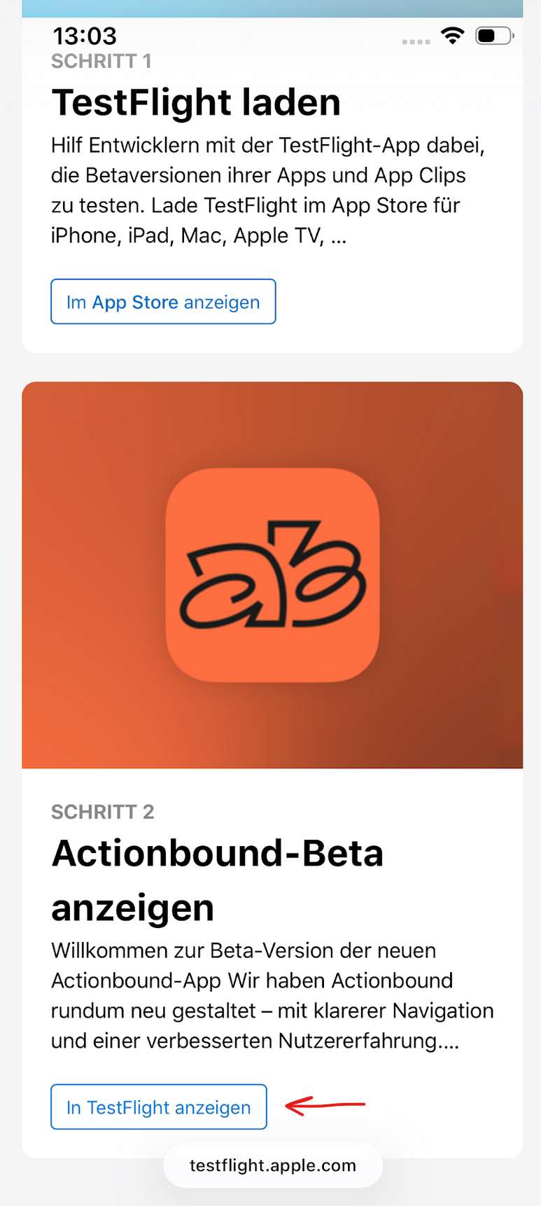 Auf dieser Seite unter „Schritt 2 - Actionbound-Beta anzeigen“ den Button „In Testflight anzeigen“ klicken: